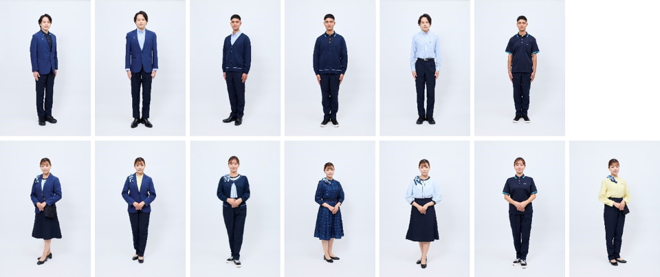 デザインはKDDIブルーをイメージしたネイビーが基調になっており、今回のリニューアルでは女性向けの長袖イエローシャツが導入された。
