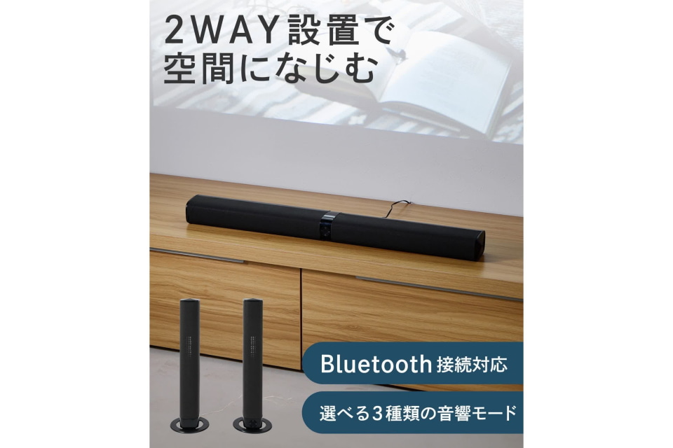 2WAYサウンドバーは、横長の一体型と左右に分けたセパレート型の2通りで使えるモデル。映画や音楽、トークなどに合わせて選べる3つのサウンドモード(MUSIC/MOVIE/VOICE)を備える。