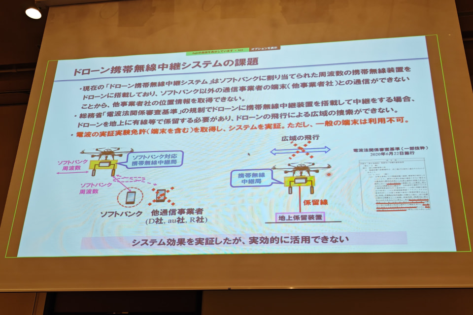 一つは、ソフトバンクに割り当てられた周波数帯を利用していたため、ソフトバンク以外の回線を使う端末の位置情報が取得できなかったキャリア依存の問題。もう一つは、電波法関係審査基準の規制により、ドローンを地上と有線で接続・係留しなければならず、広い範囲を飛行できなかった点だった。