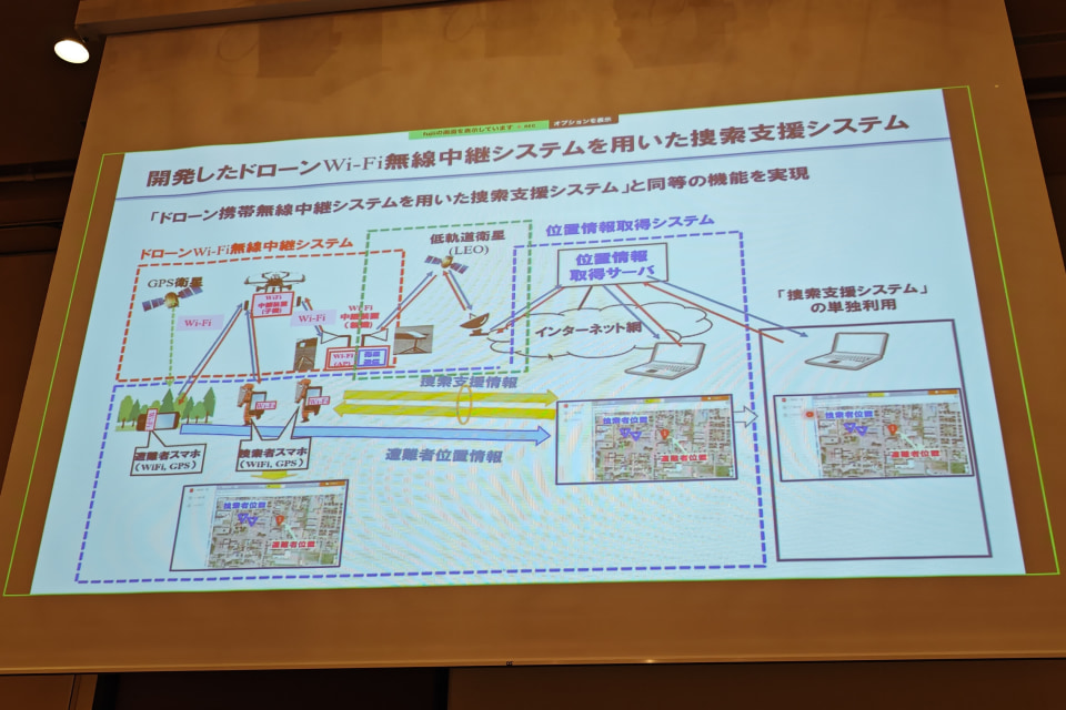上空にWi-Fi中継装置を積んだドローンを飛行させ、遭難者と捜索者の位置情報をリアルタイムで取得、共有するという仕組み。Wi-Fiを用いることで、遭難者がどの通信事業者の回線を使っていても捜索できるようになった。