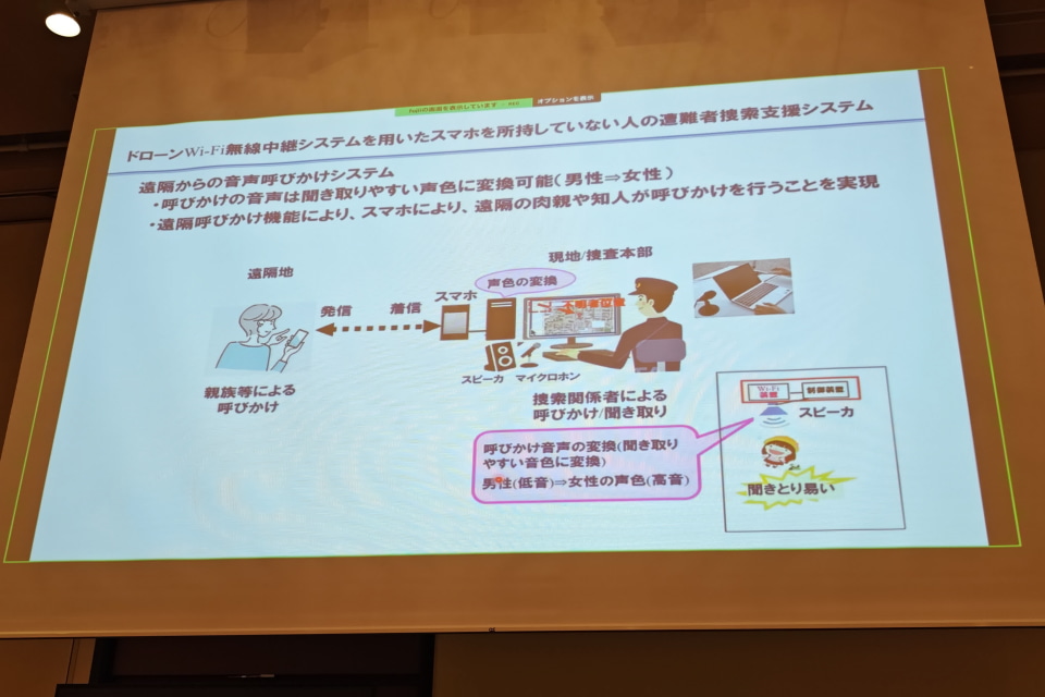 呼びかけの音声は、聞き取りやすさを優先し、低い声を女性の高い声にAIで変換して出力することが可能。また、捜索関係者がシステムにスマートフォンを接続することで、遠隔地にいる家族や知人が直接声を届けられる仕組みも用意されている。