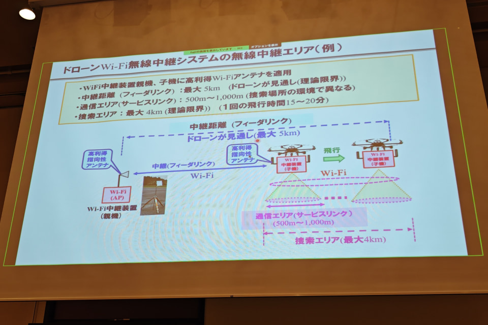Wi-Fiはモバイルネットワークに比べると通信エリアが狭いという弱点があったが、高利得の指向性アンテナをドローンに搭載することで補った。これにより、1回約15分の飛行でカバーできる捜索範囲が約3~4kmまで拡大。中継距離は最大5kmまで届くとしている。
