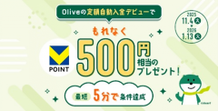 口座開設は2026年1月12日までに完了させ、2026年1月31日までにOliveアカウント契約口座(普通預金)へ一度に10万円以上を入金することで1万円相当のポイント付与条件が達成される。さらに追加特典として、同日までに1カ月もの円定期預金を預け入れ、満期まで保有することで、通常金利に加えて年2.750%相当のVポイントが上乗せされ、年3.0%(税引後2.949%)のポイント還元が受けられる。