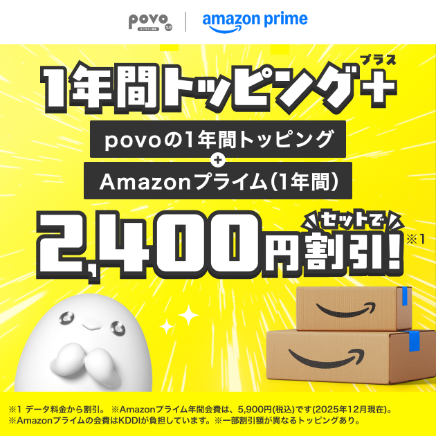 KDDIと沖縄セルラーは4日、オンライン専用ブランド「povo2.0」で、対象の1年間トッピングにAmazonプライムがセットになったトッピングを提供する。価格は1万6700円~。