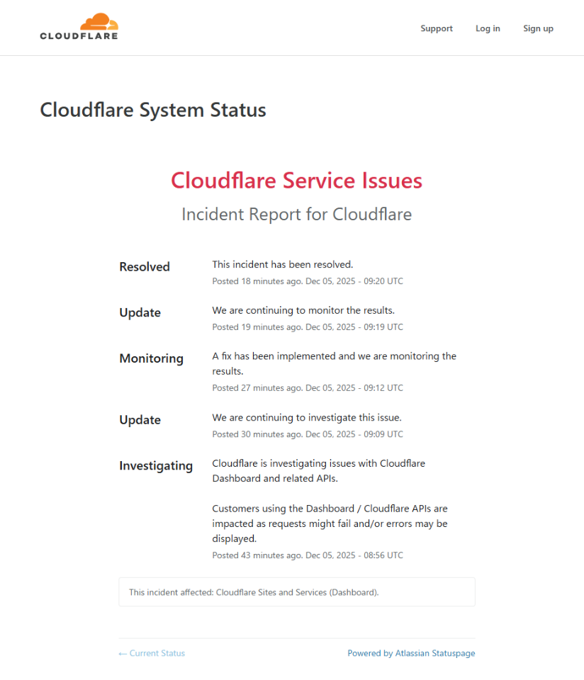 ニュースCloudflareで一時障害発生、「メルカリ」「Canva」などに影響 岩井 祐一郎2025年12月5日 18:45 日本時間12月5日17時56分頃、クラウドサービス「Cloudflare」で障害が発生し、「メルカリ」や「Canva」、「pixiv」などに影響が出ていた。 Cloudflareによれば、Cloudflareダッシュボードと関連APIに問題が生じていたが、日本時間18時20分頃に復旧したと案内している。 この障害の影響で、フリマサービス「メルカリ」やデザインツール「Canva」、イラストコミュニケーションサービス「pixiv」などが一時的に繋がりにくい状況となっていた。