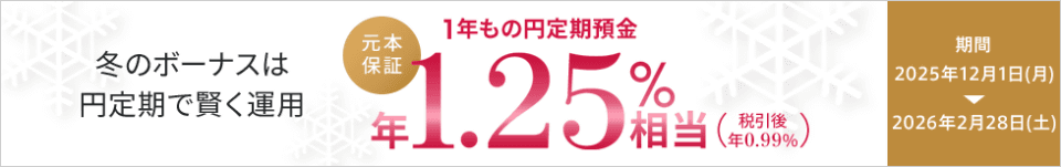 同キャンペーンでは、12月1日から2月28日の期間中に預入された1年ものの円定期預金に対して、通常金利0.40%(税引後 0.31%)に、特典として年0.65%(税引後 0.52%)を上乗せする特別金利年1.05%(税引後 0.83%)を提供する。
