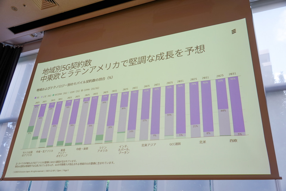 地域別では北米が早期から高い普及率を示し、2031年には90%以上へ近づく見通し。一方で現在は普及率の低いラテンアメリカや中東でも、今後5〜6年で大きく伸びるとみられる。また、2030年前後に始まるとされる6Gについても、2031年時点で約1億8000万件の契約が生まれるとの見方を示した。