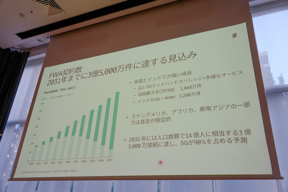 家庭や企業の固定通信を無線で代替する「FWA(固定無線アクセス)」も定着が進んでいる。世界のFWA接続数は増加しつつあり、関連トラフィックは2025年~2031年で約2.4倍に膨らむ見通し。牽引しているのは米国とインドで、米国の主要3キャリアで約1460万件、インドでは1200万件が利用されている。