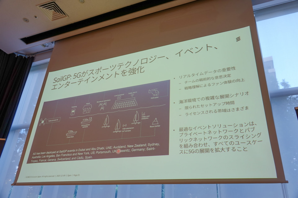 また、スポーツイベント「SailGP」では、レース艇のセンサーデータを5Gで収集し、観客・審判・放送向けにリアルタイムで配信するなど、エンターテインメント領域でも高度な活用が見られる。