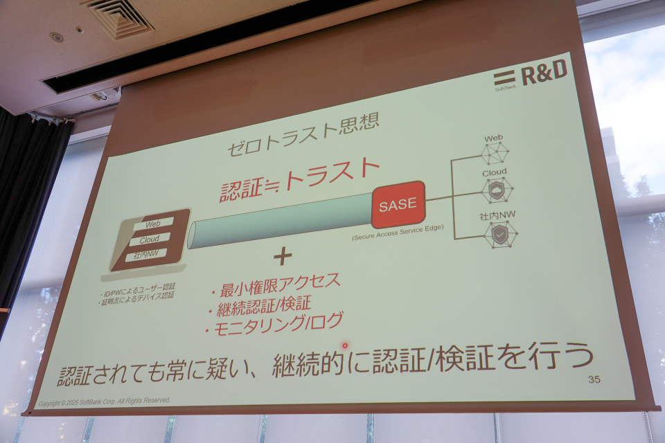 背景にあるのは、ハイブリッドワークの拡大と、それに伴うセキュリティリスクの増大。朝倉氏は、VPNを前提とした境界防御型セキュリティが限界を迎えており、VPN機器の脆弱性やランサムウェア被害が大きな脅威になっていると説明。これに対し、ゼロトラストの思想に基づき、パソコンそのものを常時安全なネットワークにつなぐ新しいアプローチを提案した。