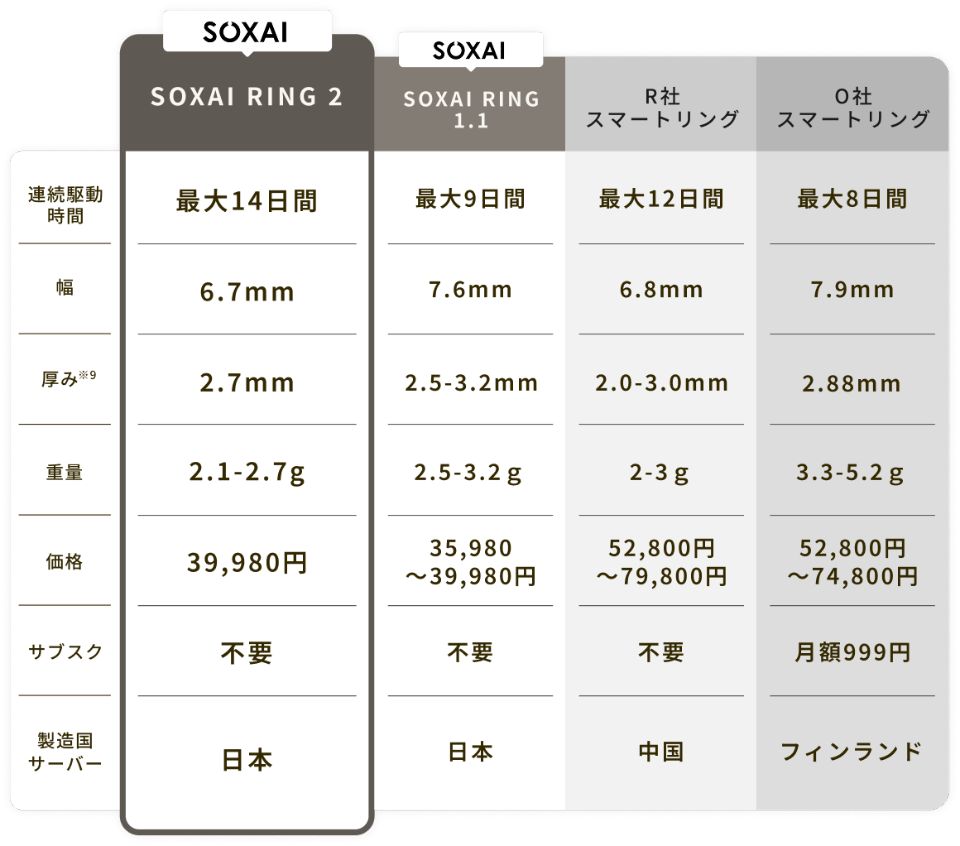 本体サイズは幅6.7mm、厚み2.7mmとスマートリングとしては世界最細クラスを実現しており、装着時の違和感を軽減した。バッテリー性能も向上し、60分から120分の充電で最大14日間の連続使用が可能となった。前モデルと比較して約1.5倍の駆動時間を実現した。