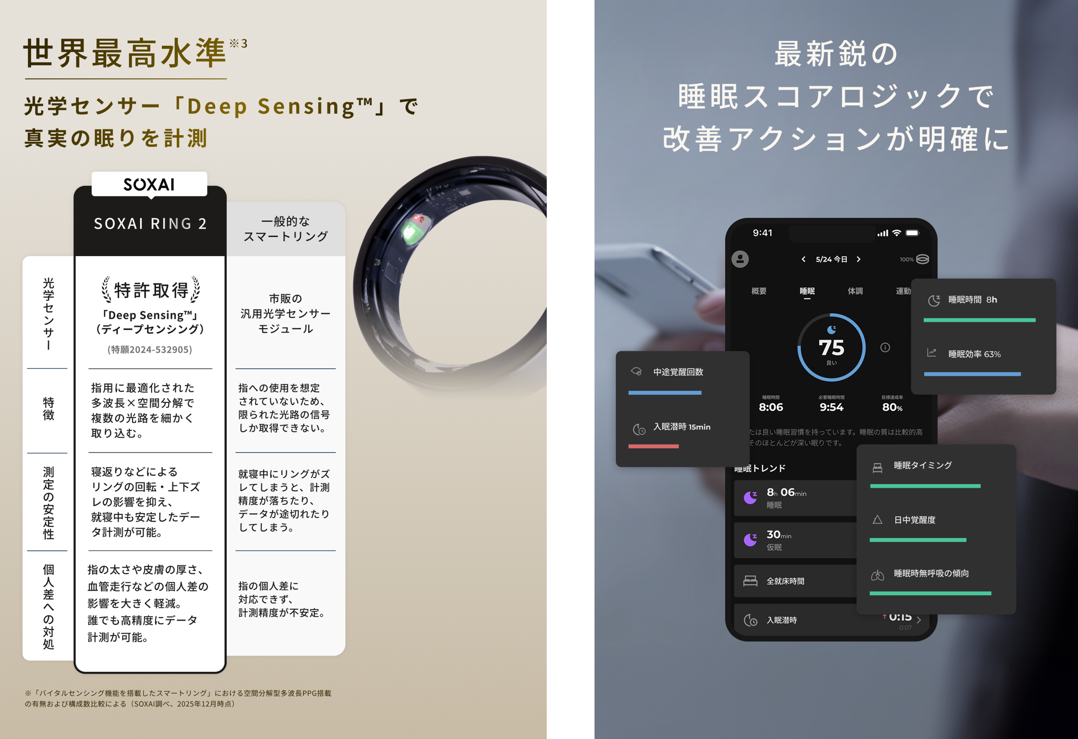「SOXAI RING 2」は、睡眠データや体調、運動などのバイタルデータを取得・分析できる指輪型のウェアラブルデバイス。特許取得済みの光学技術を活用した独自の光電容積脈波(PPG)センサー「Deep Sensing」を新たに搭載した。従来モデルと比較して、計測精度が大幅に改善され心拍数や体温、血中酸素レベルなどをより正確に取得できるようになったほか、睡眠時無呼吸の兆候もこれまで以上の精度で把握できるという。