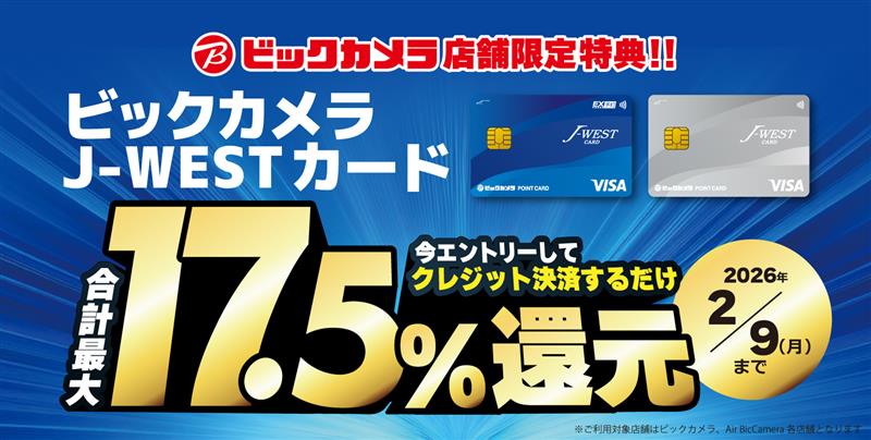 ビックカメラグループは、対象の8店舗で「ビックカメラ J-WESTカード」で支払うと、購入金額の5%分のWESTERポイントを付与するキャンペーンを開始した。期間は12月10日~2026年2月9日。通常の還元を合わせて合計最大17.5%の還元を受けられる。