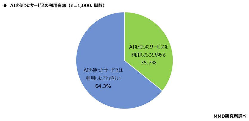 AIを使ったサービスを利用したことがある人は35.7%となった。利用経験のあるAIサービスの種類では、「AIによる検索機能」が61.7%、「AIチャットボット」が35.5%、「翻訳・画像補正などのAI機能」が31.8%となった。