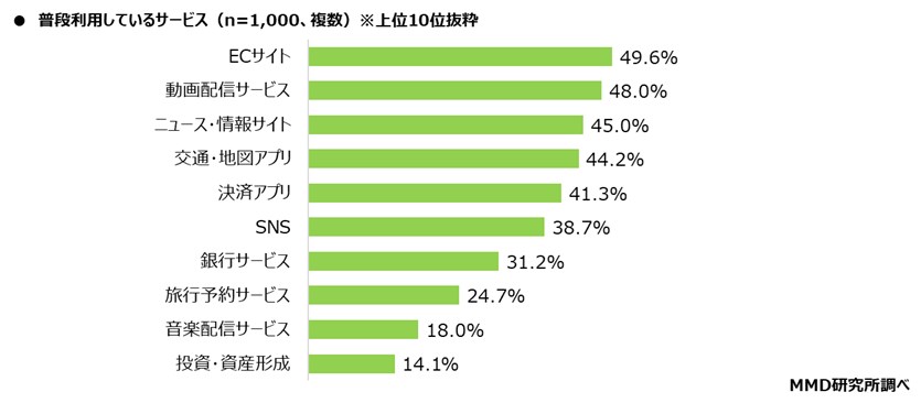 普段利用しているサービスは、「ECサイト」が49.6%、「動画配信サービス」が48.0%、「ニュース・情報サイト」が45.0%となる。