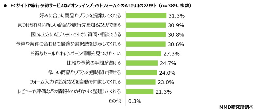 メリットとして感じている項目は、「好みに合った商品やプランを提案してくれる」が31.3%、「見つけられない新しい商品や旅行先を知ることができる」が30.9%、「困ったときにAIチャットですぐに質問・相談できる」が30.8%となった。