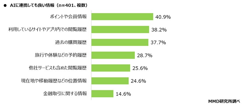 このほか、ECサイトや旅行予約サービスでAIに任せても良いと思う範囲がある人は42.7%。内訳は「自分に合う商品やプランを提案してもらうまで」が30.5%、「商品やプランをかごや旅程に追加してもらうまで」が8.6%、「実際の決済や予約の手続きまで」が3.6%となった。