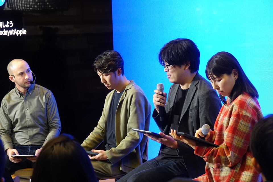 10日にApple 表参道で開催された「Today at Apple」に登壇したのは、ポケポケを制作するゲーム制作会社クリーチャーズ 執行役員の岡本康太氏、同じくクリエイティブディレクターの辻川亮氏、シニアイラストディレクターの齊藤はる氏の3人。