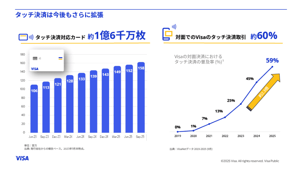 国内でのタッチ決済に対応するVisaカードの発行枚数は、2025年9月末で約1億6,000万枚に達しているという。タッチ決済に対応するカードを持っている人が多くなっていることで、必然的にタッチ決済を利用する人も増えているわけだ。