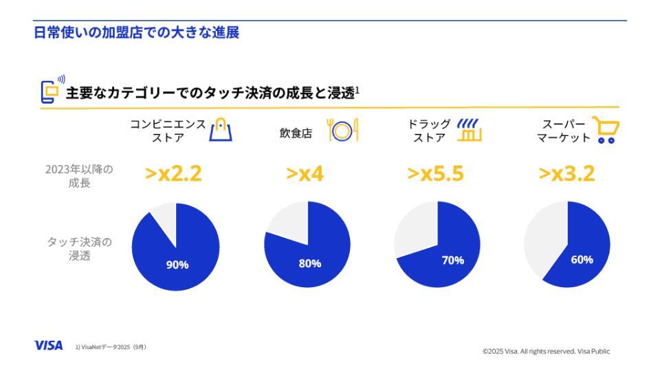 Visaの調べによると、2025年9月のクレジットカード決済のうちのタッチ決済の割合は、コンビニエンスストアで90%、飲食店で80%、ドラッグストアで70%、スーパーマーケットで60%と、いずれもかなり高い割合となっている。しかも、その割合は2023年時点と比較して2.2~5.5倍にも達しているそうだ。