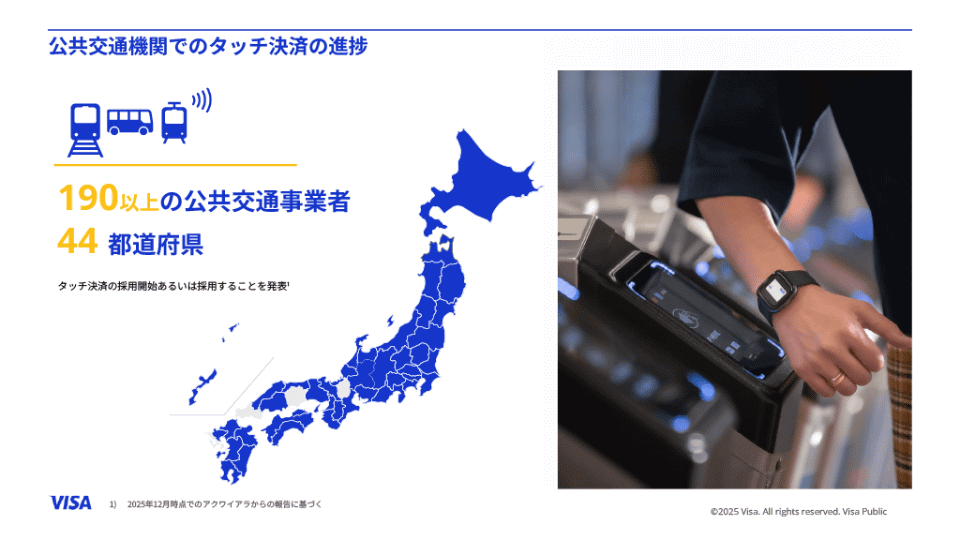 日本の公共交通機関でのタッチ決済対応は、2025年12月現在で190以上の公共交通事業者、44都道府県ですでに導入あるいは導入開始を発表しているという。キトニー氏によると、単一市場におけるタッチ決済での公共交通機関乗車の導入数としては世界最大規模であるとのことで、こちらも急速な普及が進んでいる。