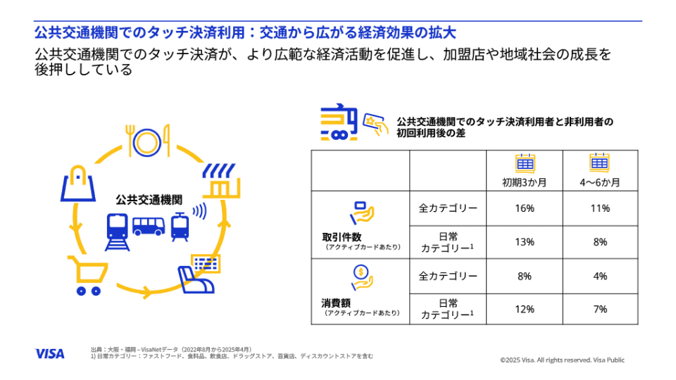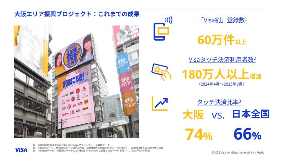 そして、特にタッチ決済の利用が大きく伸びているのが大阪地域だ。これは2025年4月から9月にかけてVisaが実施した「大阪エリア振興プロジェクト」によるところも大きいが、その期間中のタッチ決済の割合は、全国平均の66%に対し大阪地域では74%にも達したという。