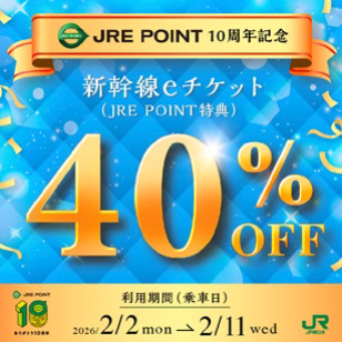 2026年2月2日~11日までの乗車分を対象に、ポイント交換で利用できる「新幹線eチケット(JRE POINT特典)」が、通常レートから40%割引で交換できる。