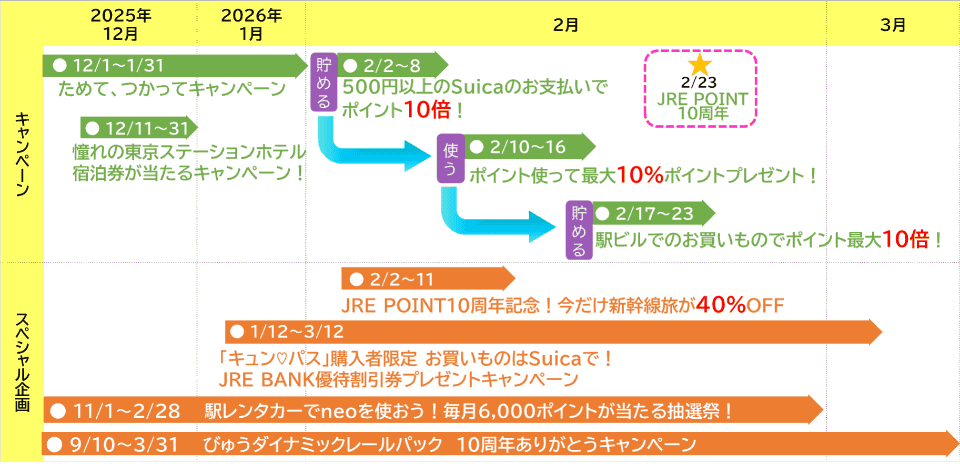 2026年2月の誕生月にあわせて、SuicaとJRE POINT(利用と積算)で3つのキャンペーンが実施される。