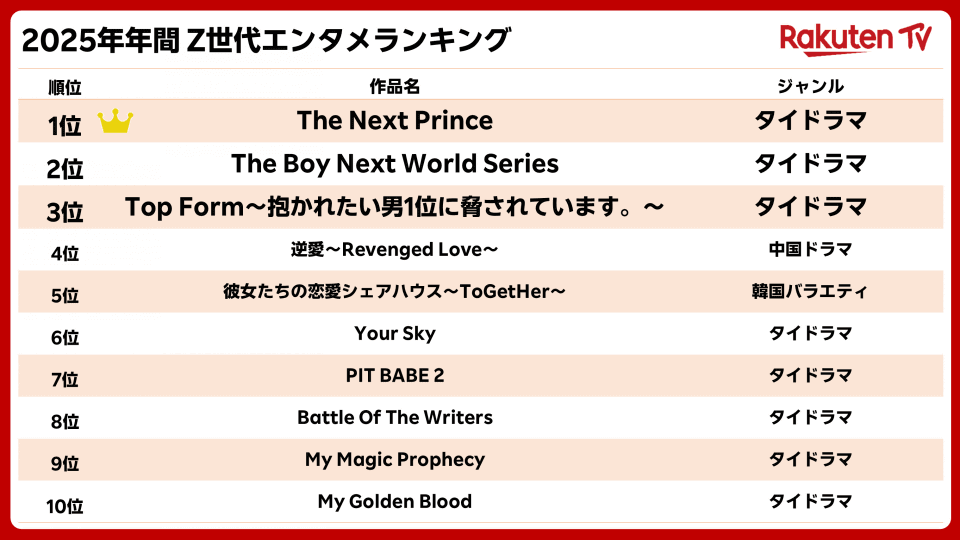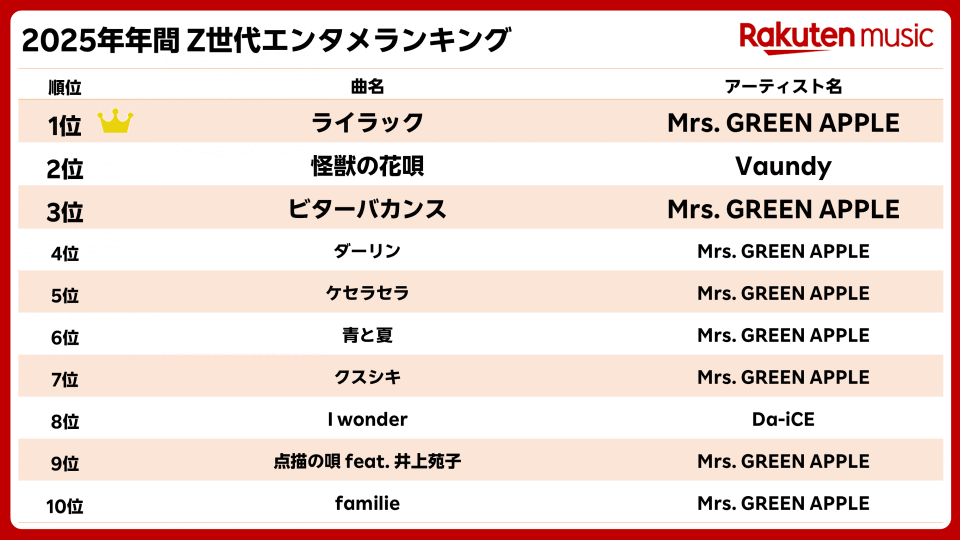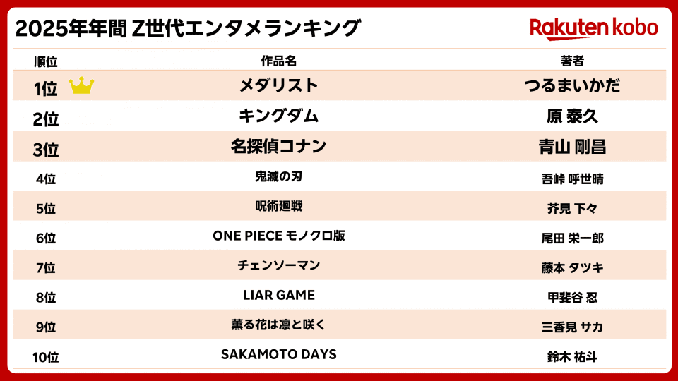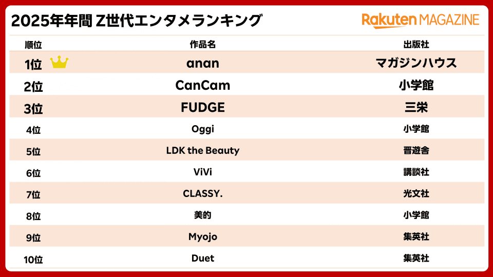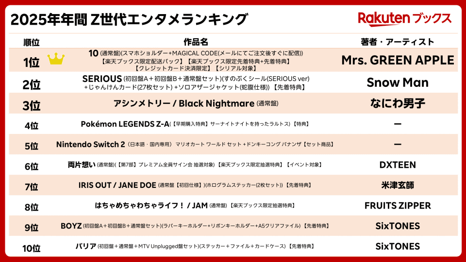楽天グループは、「楽天ブックス」、「楽天Kobo電子書籍ストア」、「楽天マガジン」、「Rakuten Music」、「Rakuten TV」を対象に集計した「2025年年間 Z世代エンタメランキング」を発表した。