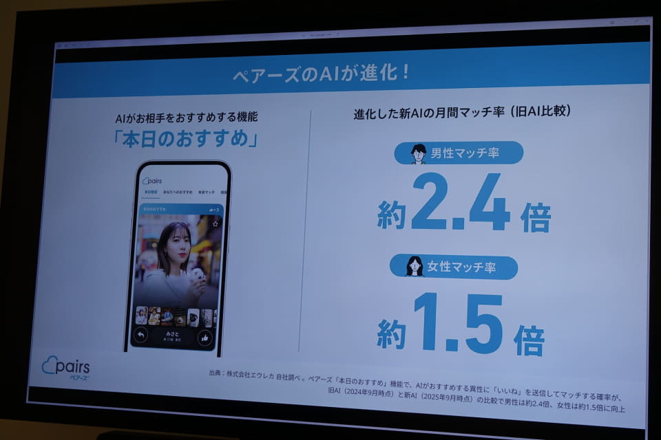 マッチングアプリに登録している数多のユーザーから、相性が合う相手を見つけるにはどうしたらいいのか? ペアーズでは、「本日のおすすめ」と称するAIが相手をおすすめする機能を搭載している。従前からAIを使ってユーザーを紹介していたが、2024年10月に新しいAIを導入した。AIマネージャーの臼井友亮氏によると、この進化したAIを導入することで、旧AIと比較して男性ユーザーのマッチ率(「いいね」を送信した割合)が約2.4倍、女性ユーザーのマッチ率が約1.5倍になったという。
