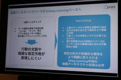ディープラーニングについて、臼井氏は「より解像度が上がった。線形的だったものが、面的なものに広がった」と説明。天文学的数字の組み合わせがあるなか、同社独自の手法で先述のマッチ率向上に寄与したかたちだ。