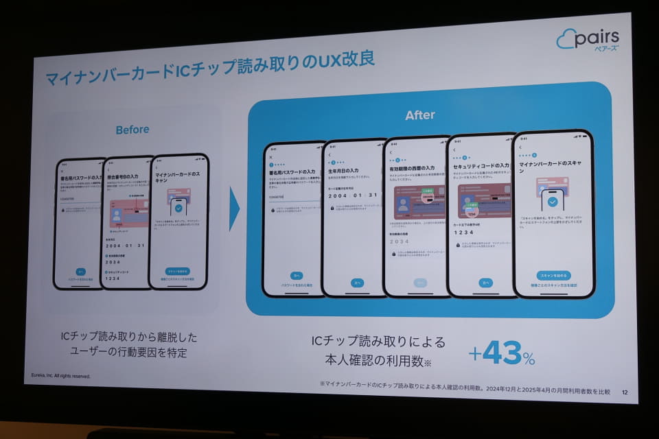 本人確認への障壁を下げる取り組みも進めている。特に、eKYCでの確認では、ユーザー自身で顔写真を撮影しなければならず、抵抗を感じるユーザーが一定数存在する。マイナンバーカードを使った認証では、ICチップを読み取ることで確認できるが、ICチップ読み取りに際してパスワードやセキュリティコードなど入力が必要なものもあり、中にはわかりづらかったり、親しみがなかったりするものもある。同社では、入力フローをあえて細分化し、ユーザーが迷わないように改良した。これにより、ICチップ読み取りによる本人確認の利用数は、改良前と比較し43%増加したという。