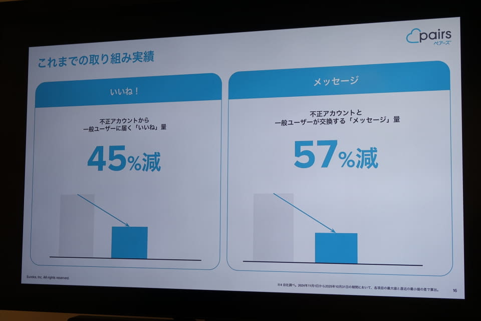 先述の高度な本人確認方法の導入や啓発活動により、不正アカウントから一般ユーザーに届く「いいね」の数は45%減少、「メッセージ」も57%減少し、一定の効果を出している。