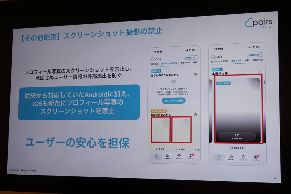 たとえば、11月にはプロフィール写真のスクリーンショットを禁止する機能を導入した。「禁止」と謳うだけでなく、実際にスクリーンショットを撮影すると、プロフィール写真の部分が保存されないようアプリの仕様から変更を加えたかたち。ほかのSNSなどにさらされたり、別の犯罪行為やなりすましアカウントに悪用されたりするなど、あらゆる犯罪、迷惑行為からユーザーを守るための機能だ。