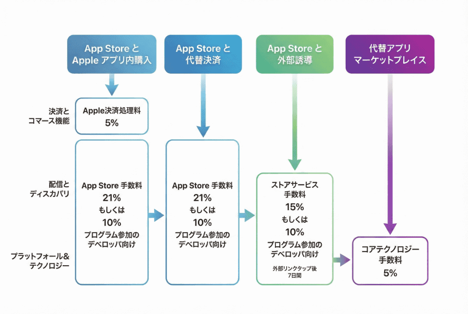 また、App Store以外で配信されるアプリについては、デジタル商品やサービスの売上に対し5%の「コアテクノロジー手数料(CTC)」の支払いが求められる。アップルによれば、事業者からの申告をもとに算出される。