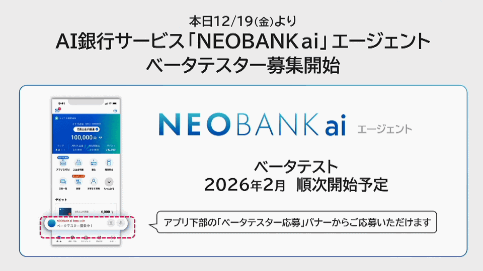 住信SBIネット銀行でAI銀行サービス「NEOBANK ai」 住信SBIネット銀行は19日、同社のスマートフォンアプリでAI銀行サービス「NEOBANK ai」を提供すると発表した。まずは、2026年2月からベータテストが開始される。