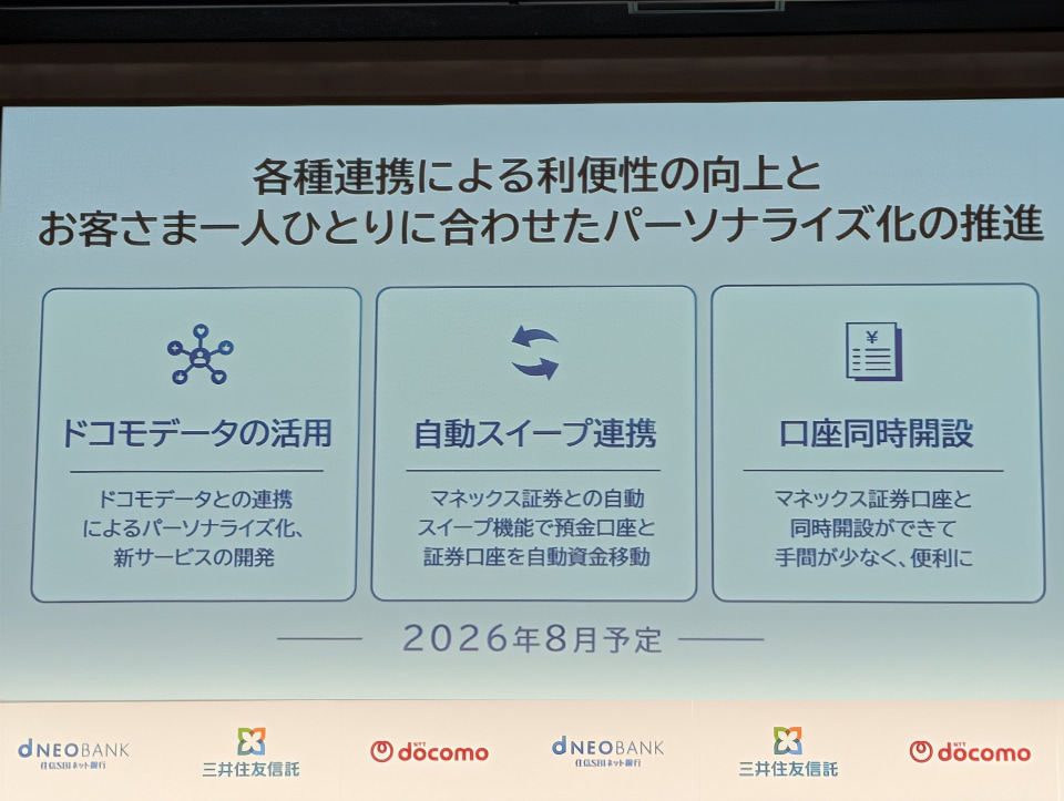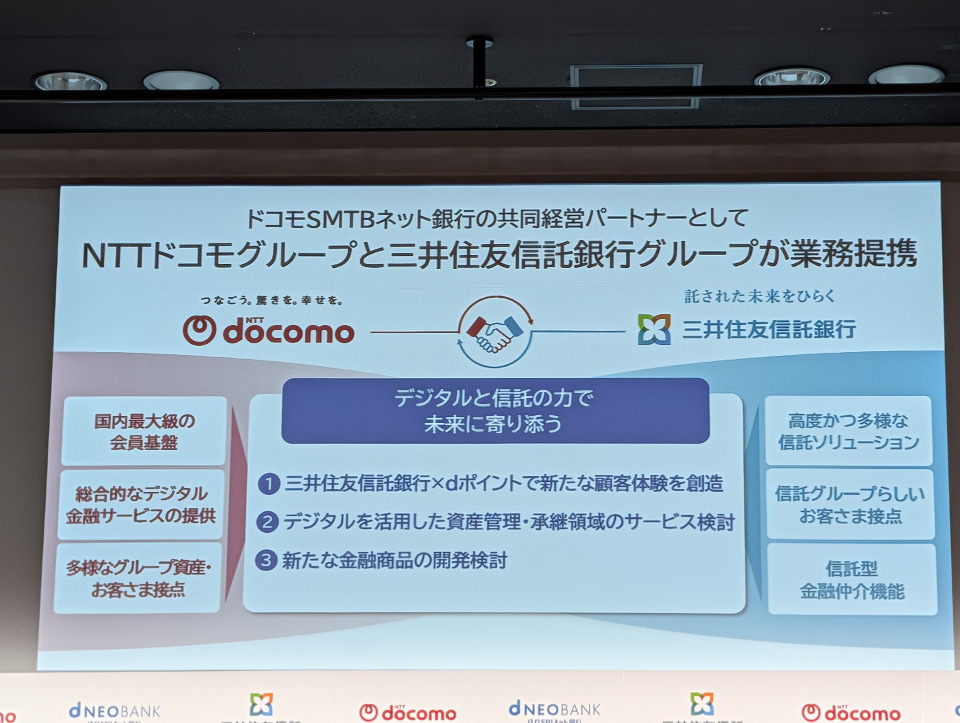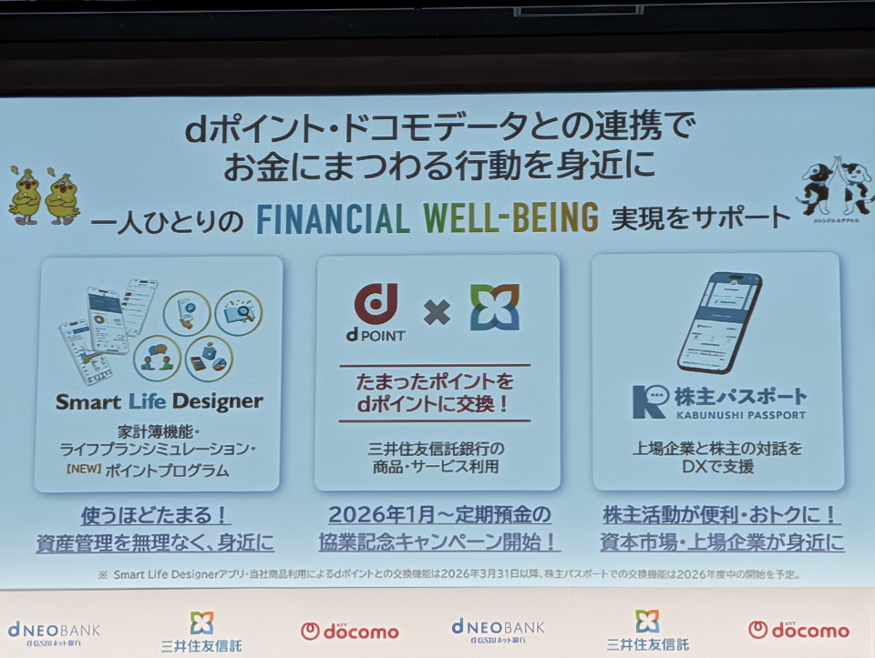 NTTドコモ、三井住友信託銀行、住信SBIネット銀行の3社は12月19日、住信SBIネット銀行の社名をドコモSMTBネット銀行に変更すると発表した。あわせて、ドコモの経済圏と連携した新たな特典や、AIを活用した次世代の銀行サービスを2026年より順次提供する。