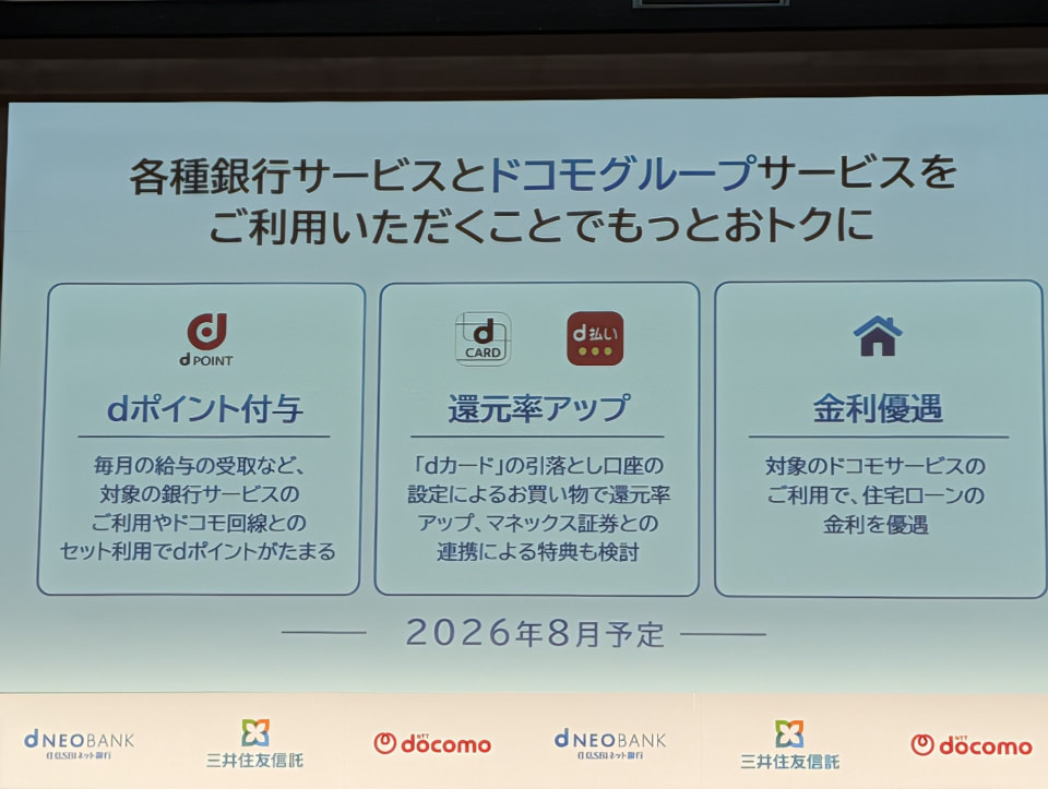 ドコモと住信SBIネット銀行の連携により、銀行取引を通じてdポイントがたまる新たな特典が2026年8月から開始される予定だ。