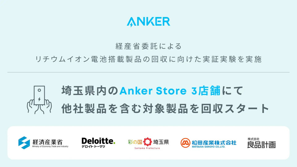 埼玉県、経済産業省、デロイトトーマツ、松田産業、良品計画と共同で行う実証事業で、対象店舗はAnker Store 越谷レイクタウン、Anker Store Outlet 入間、Anker Store Outlet ふかや花園、期間は12月22日から1月23日まで。対象となるAnker Storeに、他社製品を含むリチウムイオン電池内蔵製品の回収ボックスを設置する。