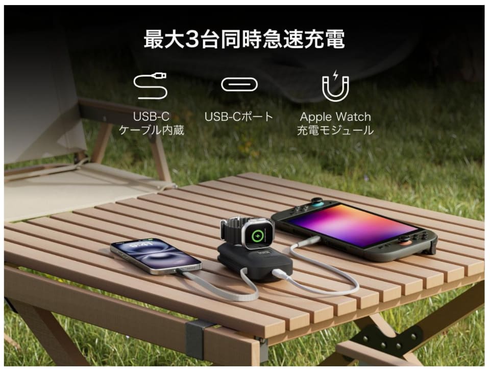 また、高耐久の編み込みUSB-Cケーブルを内蔵。Apple Watch用の充電モジュールと内蔵ケーブル、USB-Cポート経由で最大3台の同時充電に対応する。