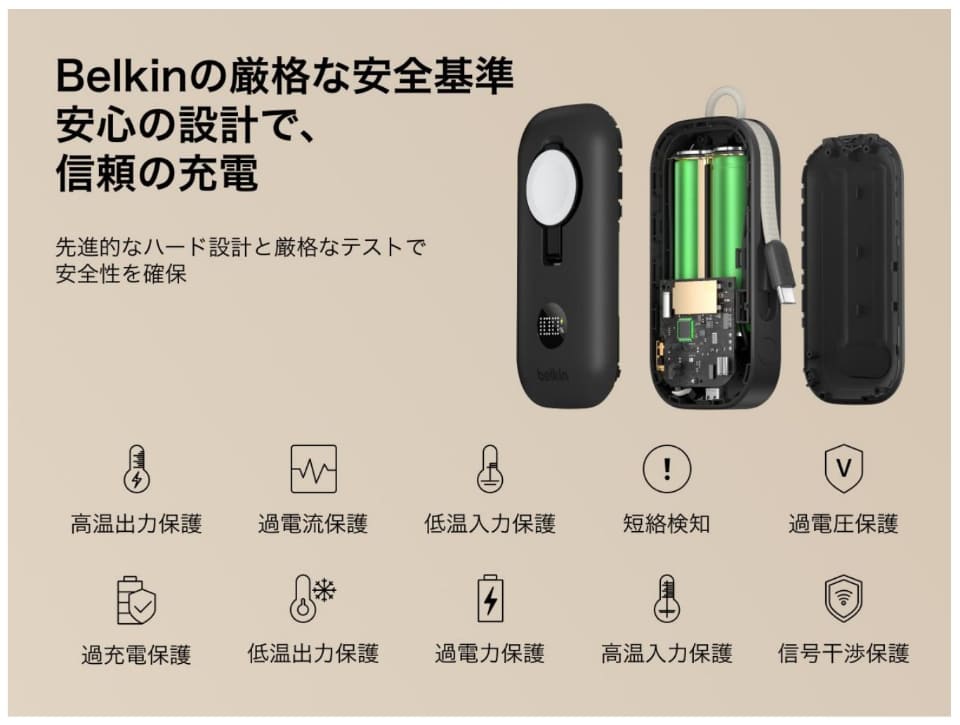 Belkinのモバイルバッテリーは二重チップ保護機能を搭載。過電流や過電圧、過熱に対する自動保護機能を備え、安全性に配慮した仕様となっている。