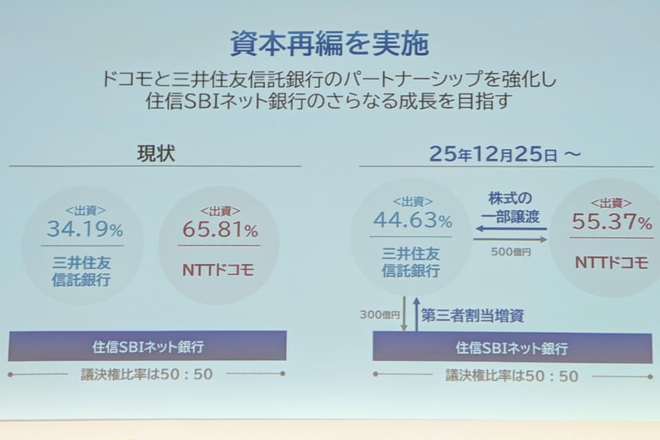 社名変更に先立ち、12月25日には資本再編を進める。具体的には、ドコモが所有するネット銀行の普通株式の一部を三井住友信託銀行に譲渡するほか、ネット銀行は三井住友信託銀行を割当先とした第三者割当増資を実施し、三井住友信託銀行の出資比率を引き上げる。