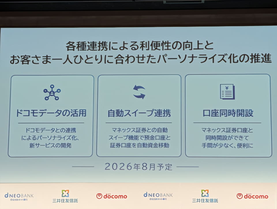 また、ドコモグループのマネックス証券との連携サービスをスタートさせる。証券取引がスムーズに行える自動スイープ機能や、同時にネット銀行とマネックス証券の口座が開設できるようなサービスを2026年8月に開始する。