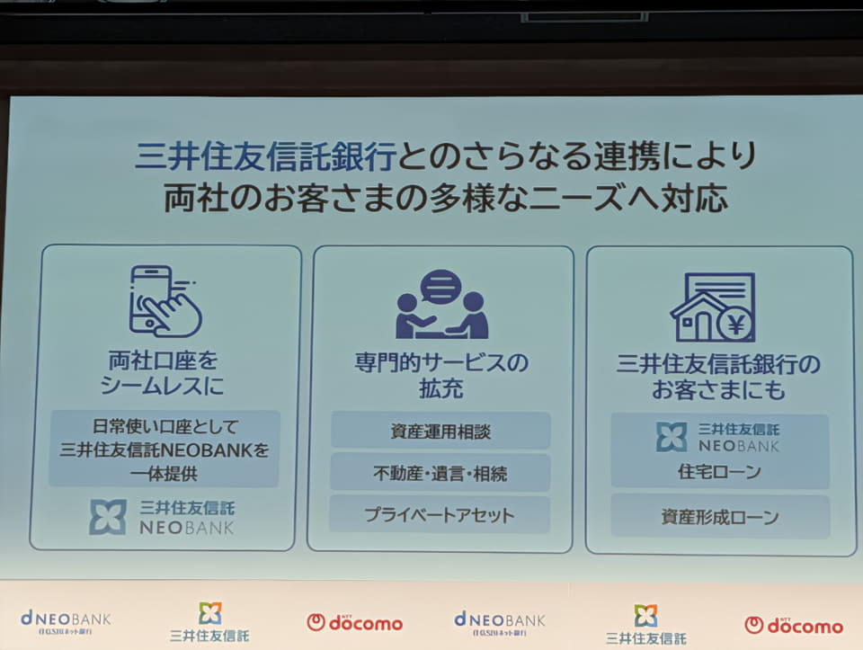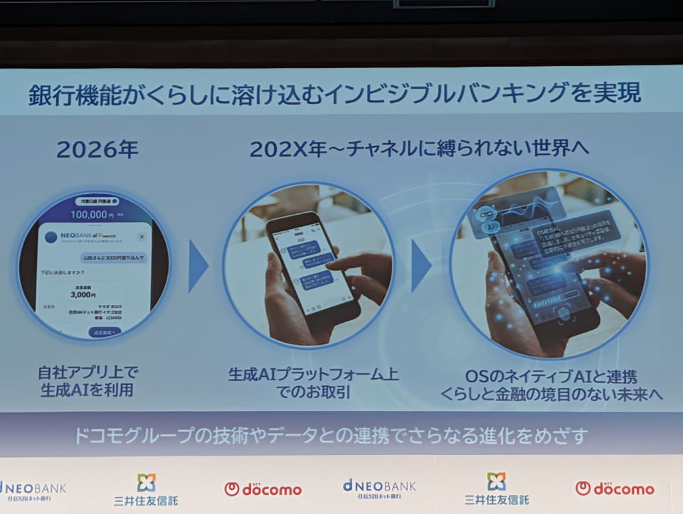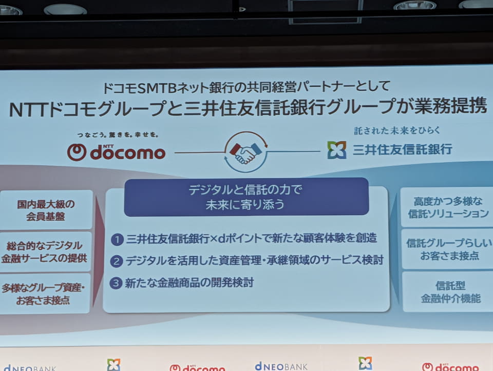 NTTドコモと三井住友信託銀行、住信SBIネット銀行は19日、住信SBIネット銀行の社名変更や協業施策を発表した。より出資元(ドコモと三井住友信託銀行)がわかるよう“ドコモ”と“SMTB”を冠した銀行名を「ドコモSMTBネット銀行」に変更し、2社との連携が強化されるほか、AIを活用した新サービスを2026年以降に順次提供する。
