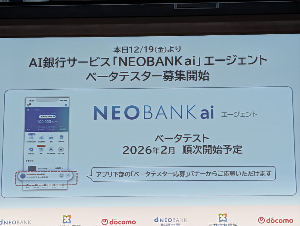 「NEOBANK Ai」について円山氏は「すでに完成している」「開発環境では完成している」とコメント。2026年2月からのベータテストを経て、2026年中の一般提供を目指す。円山氏は、「最終的には、OSやデバイス、アプリに依存しないAIサービスを実現できる」とコメント。“暮らしと金融の境目のない未来”を目指し、これらの取り組みを進めると語った。