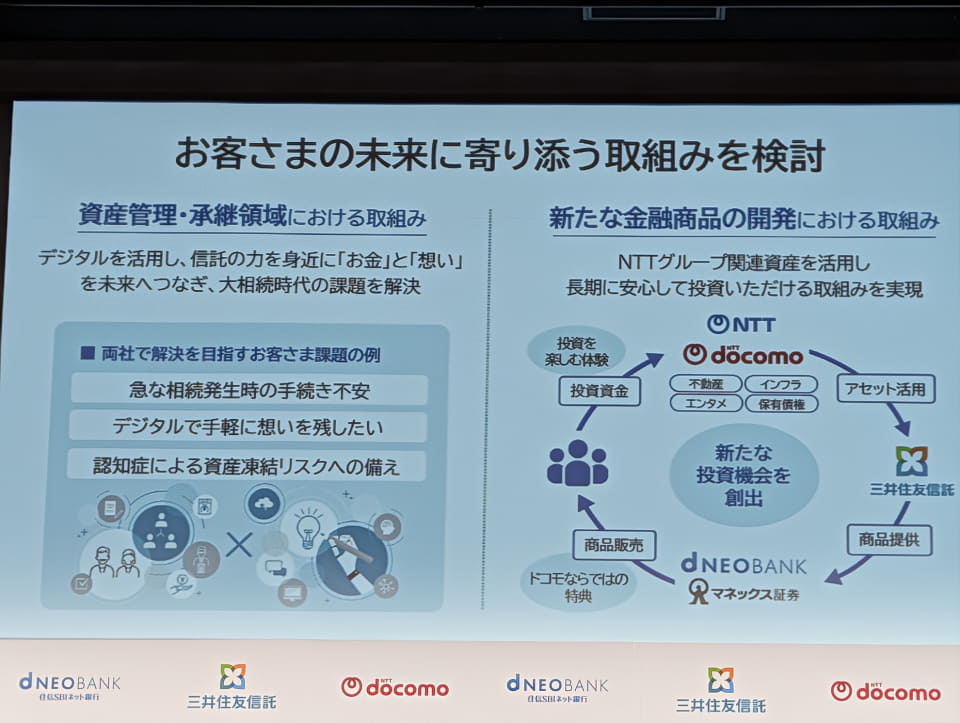 不動産や資産の管理、継承で高い専門性を持つ三井住友信託銀行と、暮らしを支える幅広いサービスを提供し1億のユーザーと接点を持つドコモ、テクノロジーで利便性と安全性を両立したサービスを提供するネット銀行の3社それぞれの強みをかけ合わせることで「ユーザーが意識せず、日々の生活の中で金融サービスの恩恵を自然に受けられる」世界を目指すと前田氏は説明。ドコモの通信や暮らしのサービスと結びつくことで、さまざまな場面で自然にお得を実感でき、三井住友信託銀行が得意とする資産形成から将来設計まで人生の多彩な選択肢を提供することで、ユーザーの人生により長くより深く寄り添えるようになるとした。