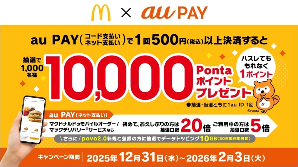 期間中、マクドナルドの対象店舗で1回あたり500円以上をau PAYで決済したユーザーを対象に抽選を実施、1000人に1万Pontaポイントが進呈される。抽選に外れたユーザーには、もれなく1Pontaポイントが進呈される。