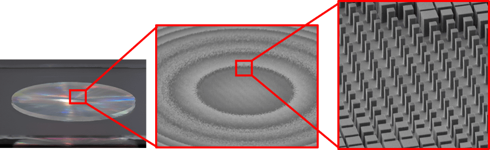 メタレンズは、ガラス表面に光の波長より小さな柱状構造「メタアトム」を並べることで光を制御する「メタサーフェス技術」が使われている。このメタアトムの設計により、光の波長や位相を制御するなど複数の光学特性を結合できるため、光学部品数を削減できる。