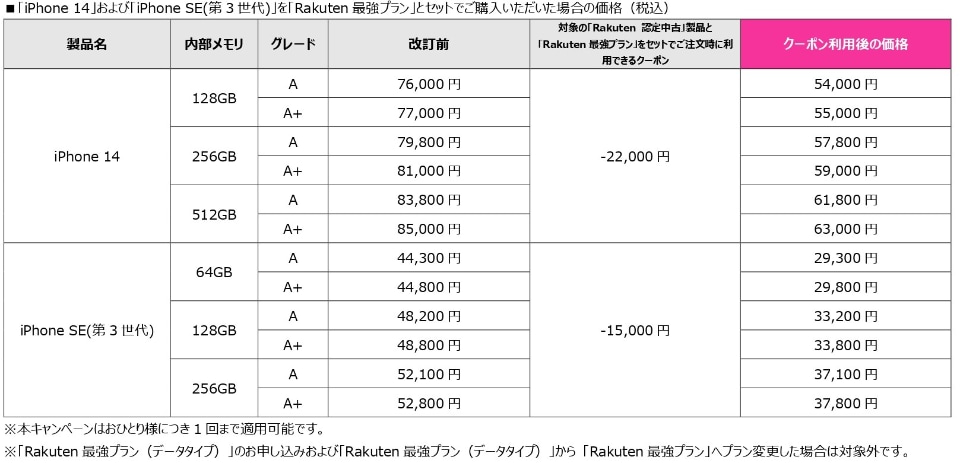 楽天モバイルは、回線申込と同時に対象の認定中古iPhoneを購入すると最大2万2000円オフになるキャンペーンに「iPhone 14」と「iPhone SE(第3世代)」を追加した。