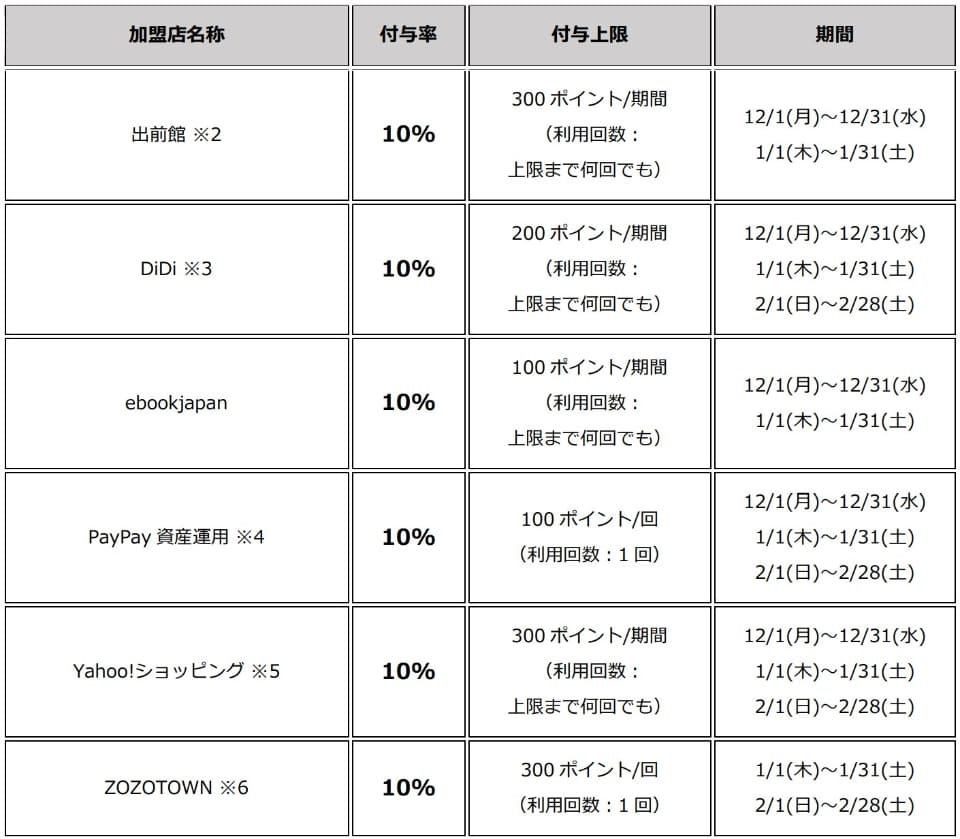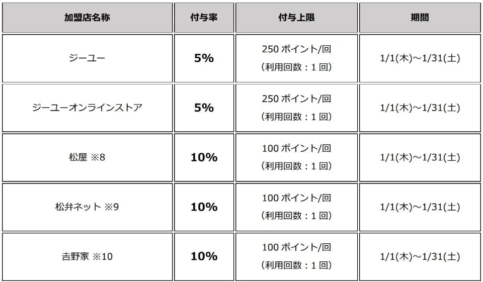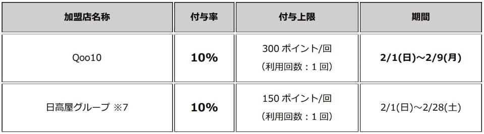 付与率や付与上限などは加盟店により異なる。期間は1月が全店舗で31日まで。2月はQoo10が2月1日~9日、それ以外が2月1日~28日となっている。
